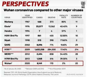 Organisasi Kesehatan Dunia (WHO) mengumumkan virus korona sebagai wabah penyakit baru. Namun berdasarkan data dari Business Insider, virus dianggap lebih ringan dibandingkan virus H1N1 atau flu babi.